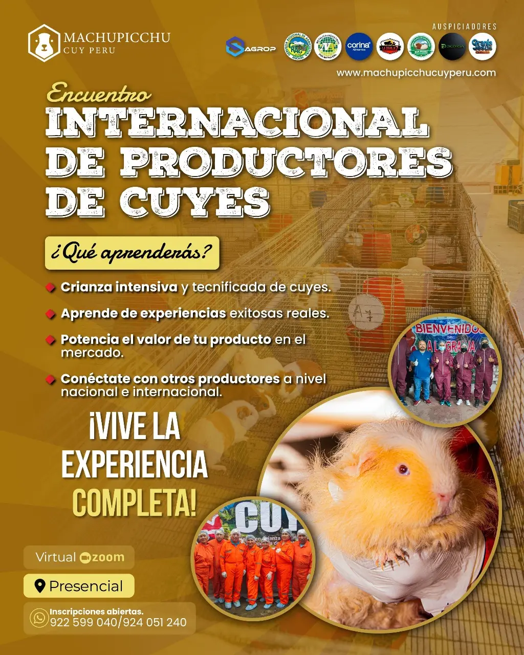 El Encuentro Internacional de Productores de Cuyes es una oportunidad única para aprender, compartir y conectar con expertos del sector. Durante dos días, productores, especialistas y emprendedores se reunirán para conocer las mejores prácticas en crianza, sanidad y gestión de granjas.
